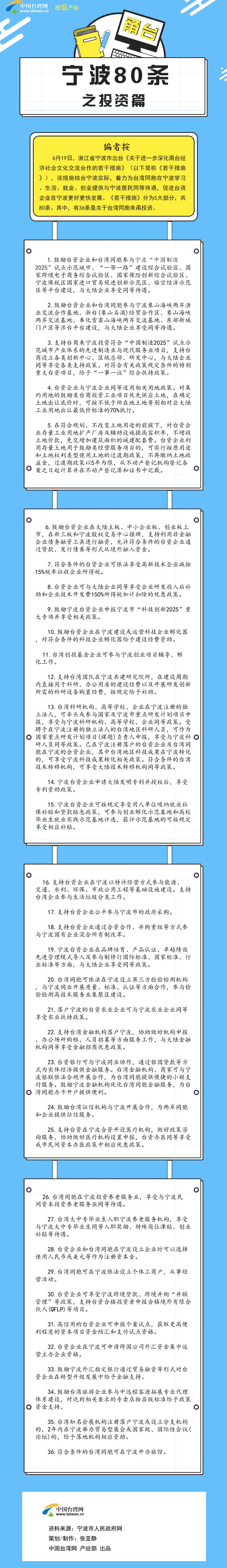 編者按:6月19日,浙江省寧波市出臺(tái)《關(guān)于進(jìn)一步深化甬臺(tái)經(jīng)濟(jì)社會(huì)文化交流合作的若干措施》,分為5大部分,共80條。其中,有36條是關(guān)于臺(tái)灣同胞來(lái)甬投資。