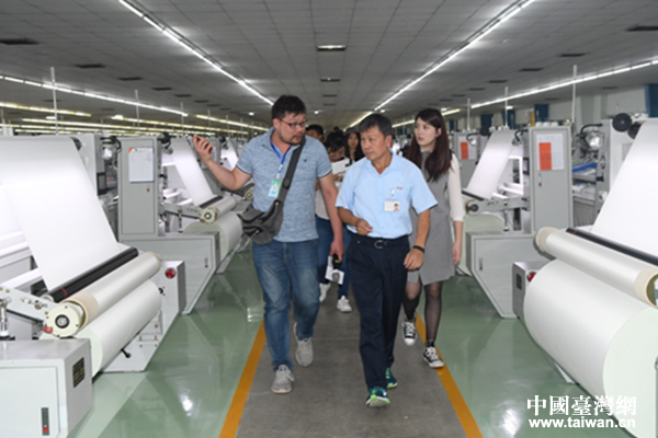 臺(tái)干林云炎介紹玻纖布制作工藝。(圖片來(lái)源:四川省臺(tái)辦)