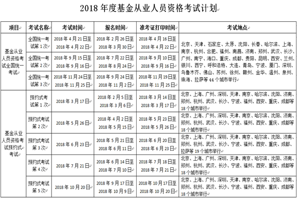 基金從業(yè)資格考試分為全國(guó)統(tǒng)考和預(yù)約式考試兩種形式,中國(guó)證券投資基金業(yè)協(xié)會(huì)2018年度考試計(jì)劃中,基金從業(yè)人員資格考試全國(guó)統(tǒng)一考試3次,預(yù)約式考試5次。具體時(shí)間安排如下圖所示。