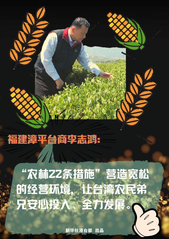 大陸又推出惠臺利民新“政策包”!《關于支持臺灣同胞臺資企業(yè)在大陸農業(yè)林業(yè)領域發(fā)展的若干措施》,簡稱“農林22條措施”,17日一經公布即受到臺胞臺企點贊嘉許。他們充分肯定措施接地氣、有針對性,涵蓋面廣,支持力度大,為臺胞臺企參與大陸農業(yè)林業(yè)高質量發(fā)展及鄉(xiāng)村振興創(chuàng)造更好條件、提供更多機遇。