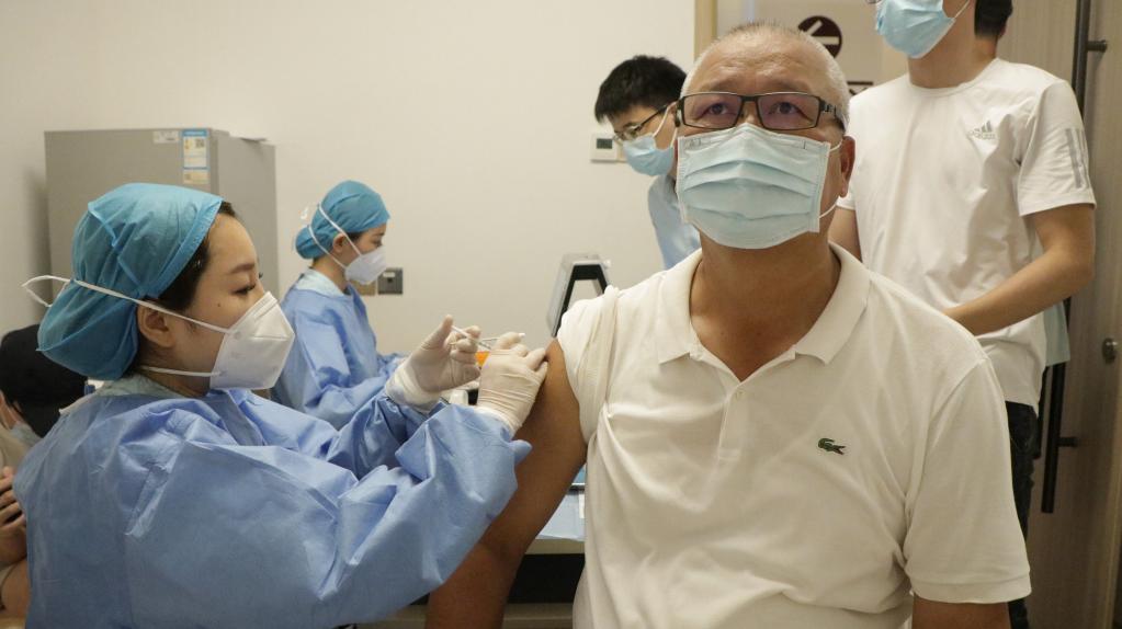 6月18日,在陸臺(tái)胞古秀亮在廣州市番禺區(qū)祈福醫(yī)院接種新冠疫苗。新華社記者 洪澤華 攝