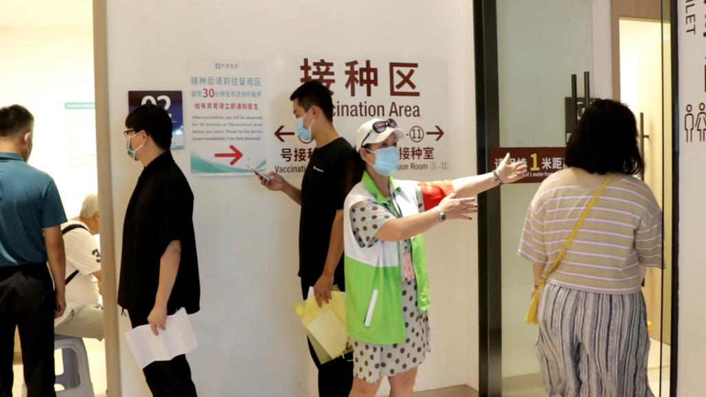 6月18日,廣東祈福醫(yī)院新冠疫苗接種點(diǎn)內(nèi),志愿者正引導(dǎo)市民有序接種。新華社記者 洪澤華 攝