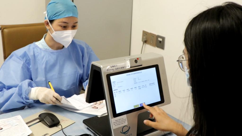 6月18日,廣東祈福醫(yī)院新冠疫苗接種點(diǎn),進(jìn)行接種的市民利用電子登記系統(tǒng)確認(rèn)接種信息。新華社記者 洪澤華 攝