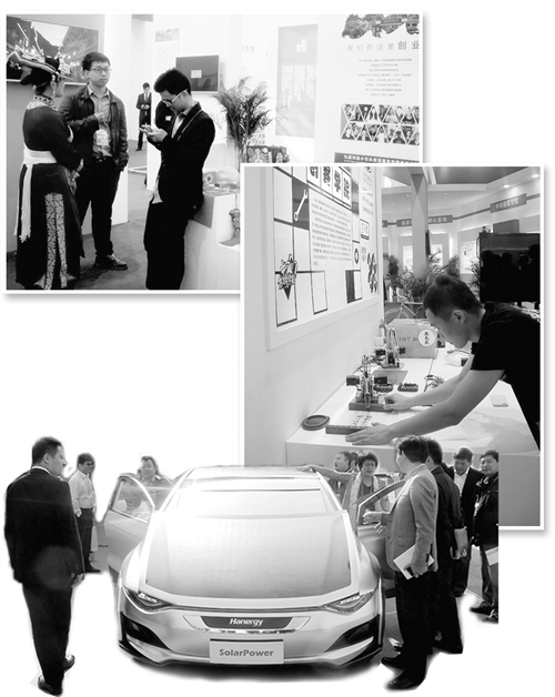 上圖 漢能集團的太陽能薄膜發(fā)電概念車,引起了許多參加首屆全國大眾創(chuàng)業(yè)萬眾創(chuàng)新活動周的創(chuàng)客關(guān)注。 本報記者 佘惠敏攝