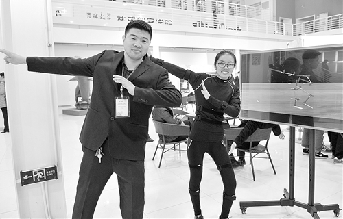 東北大學(xué)“無線動(dòng)作捕捉傳感器”項(xiàng)目創(chuàng)始人龔佳樂(左)及其團(tuán)隊(duì)成員李琪(右)在投資洽談會(huì)上展示“無線動(dòng)作捕捉傳感器”(10月19日攝)。新華社記者 許 暢攝