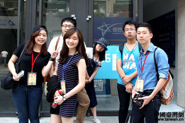 臺灣青年學(xué)生在創(chuàng)業(yè)大街拍照留念 (中國臺灣網(wǎng) 陳文韜 攝)