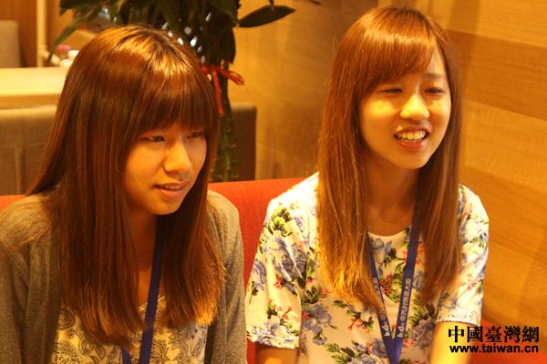 在創(chuàng)業(yè)大街實習的兩位臺灣大學生講解自己的收獲(中國臺灣網(wǎng) 陳文韜 攝)