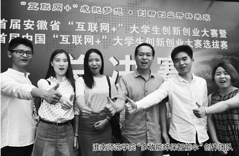 “走在雨中,一手撐傘、一手舉著自拍桿拍照,可惜拍著拍著手機(jī)就沒有電了——這就是一場悲。〔贿^,用上我們研發(fā)的‘多功能環(huán)保智能傘’后,浪漫的雨中自拍再也不會變成悲劇啦!”淮南師范學(xué)院美術(shù)與設(shè)計學(xué)院產(chǎn)品設(shè)計專業(yè)的同學(xué)們說。