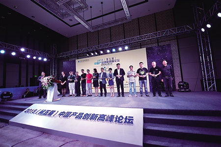 昨日,“2015(第五屆)中國(guó)產(chǎn)品創(chuàng)新高峰論壇暨全球創(chuàng)客眾籌大會(huì)”現(xiàn)場(chǎng)獲獎(jiǎng)企業(yè)代表登臺(tái)領(lǐng)獎(jiǎng)。 主辦方供圖
