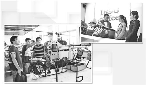 左下圖 蘭州科技大市場投入運營當天,一家企業(yè)展示的無人機吸引眾多同行業(yè)創(chuàng)客關注。 右上圖 在眾創(chuàng)空間的1898咖啡館內,甘肅啟遠智能科技公司工作人員正與另外幾名創(chuàng)客交流航模制作經驗。照片由本報記者 陳發(fā)明攝