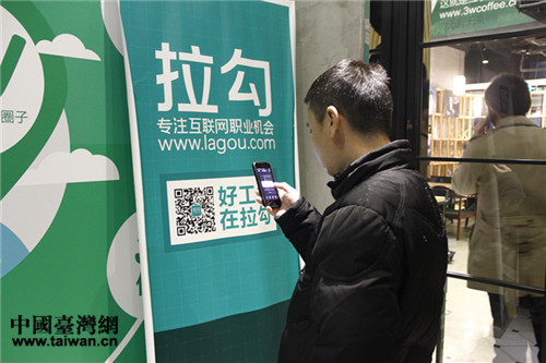 在中關(guān)村創(chuàng)業(yè)大街3W咖啡店內(nèi),一男士正在掃描拉勾網(wǎng)的二維碼。據(jù)悉,拉勾網(wǎng)為3W咖啡旗下的網(wǎng)站,主要為資深互聯(lián)網(wǎng)從業(yè)者提供招聘信息。(中國臺灣網(wǎng) 郜利敏 攝)