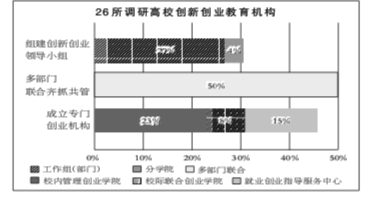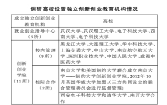 2015年,國務(wù)院辦公廳下發(fā)《關(guān)于深化高等學校創(chuàng)新創(chuàng)業(yè)教育改革的實施意見》。在此政策推動下,各高校均已把深化高校創(chuàng)新創(chuàng)業(yè)教育改革作為重要任務(wù)擺在突出位置。就目前而言,各個高校在機構(gòu)設(shè)置方面主要呈現(xiàn)出創(chuàng)新創(chuàng)業(yè)領(lǐng)導(dǎo)小組負責制、多部門聯(lián)合負責制、專門創(chuàng)新創(chuàng)業(yè)教育機構(gòu)負責制三種類型。