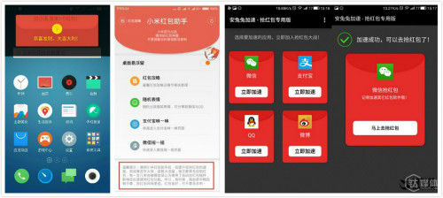 “搶紅包外掛”,這是伴隨著各類手機紅包火起來的另外行業(yè)。小米,是第一個拼搶紅包能力的智能手機,去年8月紅米note2的發(fā)布會上,雷軍不再跑分而是比起了搶紅包速度。緊隨其后的還有魅族、360、中興等主流智能手機品牌,都紛紛將搶紅包功能直接做進了手機底層系統(tǒng)。
