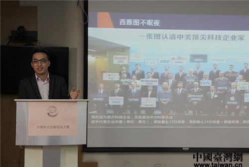 大賽總策劃岳路平現(xiàn)場(chǎng)進(jìn)行全球華人雙創(chuàng)版圖發(fā)布。(中國(guó)臺(tái)灣網(wǎng) 吳曉寒 攝)