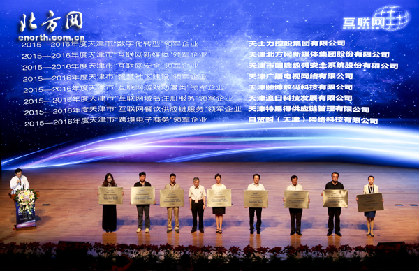開幕式上,與會領(lǐng)導(dǎo)為2015至2016年度“天津市互聯(lián)網(wǎng)行業(yè)8大類型領(lǐng)軍企業(yè)”頒牌。天津北方網(wǎng)新媒體集團股份有限公司榮獲“互聯(lián)網(wǎng)新媒體”領(lǐng)軍企業(yè)榮譽稱號。