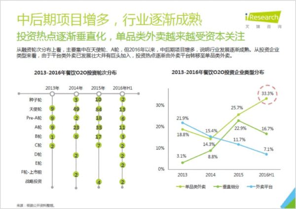 外賣O2O依然處于井噴階段,用戶的消費能力增加也導(dǎo)致了其從價格敏感轉(zhuǎn)向了品質(zhì)敏感,也在反過來倒逼整個外賣行業(yè)的質(zhì)量提升,安全、餐飲品類、物流等等通通需要全面的提升,單品和垂直類外賣之所以在后期受到投資青睞正是因為其能夠更為專注的做到從安全到物流的各項品質(zhì)服務(wù),而其服務(wù)的用戶也偏中高端,有著更高的消費能力與黏性,可以最早實現(xiàn)盈利,繼而成為投資的新寵。