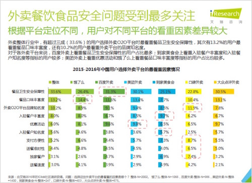 消費能力的提高通常也伴隨著對于品質(zhì)要求的提高,艾瑞將每一個用戶評判品質(zhì)的維度做了一個全面的統(tǒng)計,安全問題、口味豐富、平臺知名度等等都是用戶考量的因素。