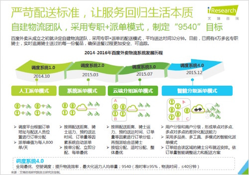 以百度外賣為例,其背后有著百度強大的人工智能調(diào)度作為支撐,因此在外賣方面也是在一開始就建立了以大數(shù)據(jù)人工智能挖掘作為基礎(chǔ)的配送,其在2014年上線之初就采用派單模式,其從第一階段為較為簡單的人工派單形式,進化到了第四階段開始對商戶進行更精確的分級、并采用多品類、多工具、多模式的智能化派單模式,其中展示了大數(shù)據(jù)技術(shù)的進化,最終達到了準時率98.78%,平均物流時間小于32分鐘的成績。