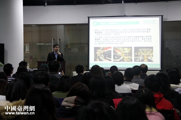 創(chuàng)業(yè)公社臺(tái)灣專區(qū)負(fù)責(zé)人鄭博宇向臺(tái)灣青年們介紹“臺(tái)灣創(chuàng)客驛站”。(中國(guó)臺(tái)灣網(wǎng) 吳曉寒 攝)