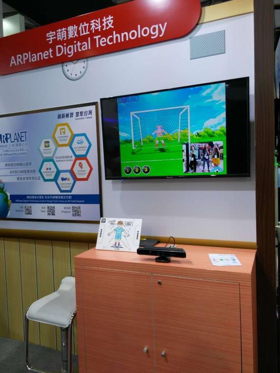 而AR Planet宇萌數(shù)位科技則更多展示了AR技術(shù)在教學(xué)以及購(gòu)物中的應(yīng)用。小朋友可以在互動(dòng)繪本中自己畫(huà)出守門(mén)員的形象,然后通過(guò)掃描,所畫(huà)的守門(mén)員投影到電視上,而守門(mén)員的動(dòng)作由繪畫(huà)的小朋友控制,可以進(jìn)行體感式互動(dòng)踢球體驗(yàn)。