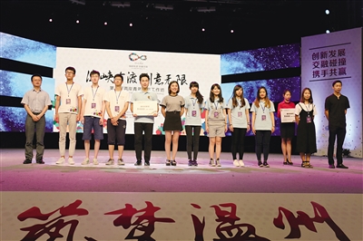 他們跨海而來,將創(chuàng)業(yè)的夢想和青春的激情,揮灑在溫州這片熱土。昨天上午,“筑夢溫州”第二屆海峽青年創(chuàng)新創(chuàng)業(yè)季活動暨“海峽有渡創(chuàng)意無限”第三屆兩岸青年創(chuàng)客工作坊成果匯報會,在市廣電中心一號演播大廳舉行。智能戒煙盒、福蝶鹿城、字繪燈等7件集結了臺灣和大陸高校學生智慧的創(chuàng)意設計精品,讓到場嘉賓感受到文化創(chuàng)意跨界、融合的魅力。