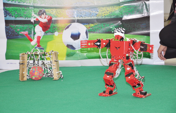 內(nèi)蒙古大學(xué)創(chuàng)新創(chuàng)業(yè)論壇上,學(xué)生們展示自己設(shè)計(jì)制作的機(jī)器人守門員。記者 章奎 攝