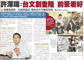 2016年8月27日,由《旺報(bào)》主辦的“2016第一屆兩岸青年創(chuàng)業(yè)論壇”在中國(guó)臺(tái)灣省新北市舉辦,91投資、91眾創(chuàng)空間、91金融董事長(zhǎng)許澤瑋受邀出席并作主題演講。許澤瑋表示,在創(chuàng)新創(chuàng)業(yè)合作上,兩岸三地生態(tài)優(yōu)勢(shì)互補(bǔ),大陸人善于學(xué)習(xí)、有創(chuàng)新精神,而臺(tái)灣人靈活、有創(chuàng)意、懂生活。非?春门_(tái)灣文創(chuàng)產(chǎn)業(yè)到大陸發(fā)展的前景。