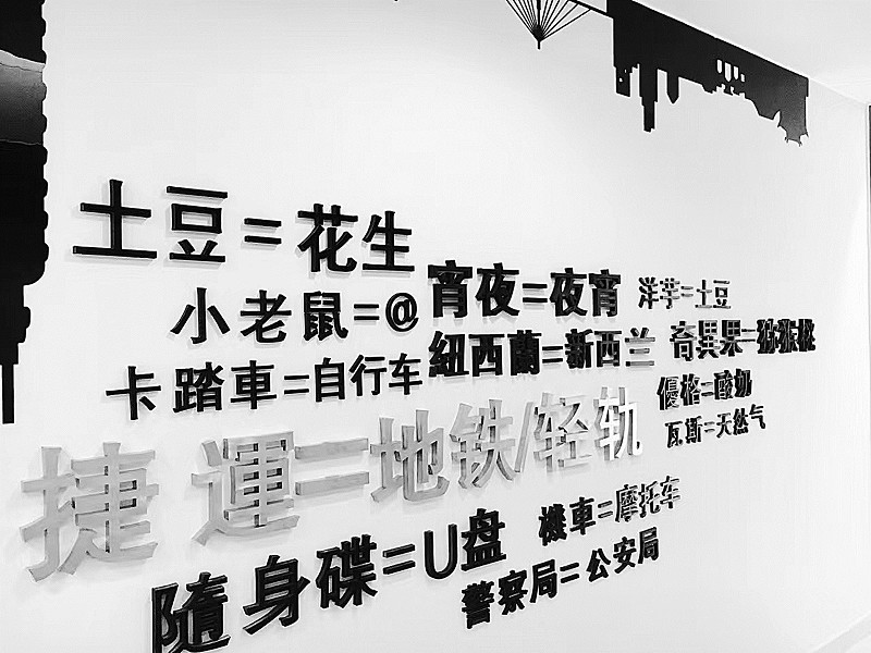 園內(nèi)墻上展示的兩岸青年熱門詞匯對照。