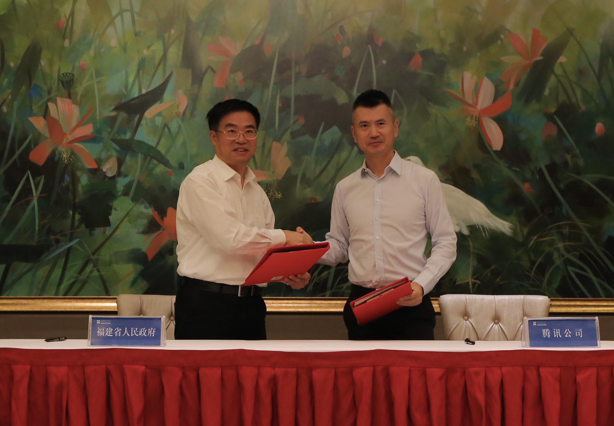 福建省副省長周聯(lián)清(左)、騰訊公司首席運(yùn)營官任宇昕(右)簽署戰(zhàn)略合作協(xié)議