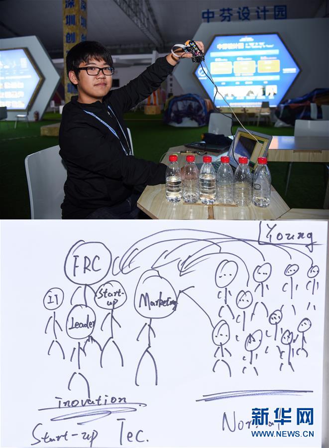 上圖:10月12日,深圳本土“小創(chuàng)客”吳子謙展示他帶來的作品——產(chǎn)品庫存感應(yīng)儀,今年19歲的他已經(jīng)申請了40多項(xiàng)專利;下圖:吳子謙繪圖表示,他未來計(jì)劃就讀教育專業(yè),成為一個(gè)能幫助越來越多年輕人實(shí)現(xiàn)創(chuàng)客理想的人,讓大家根據(jù)能力擔(dān)任創(chuàng)業(yè)團(tuán)隊(duì)的領(lǐng)導(dǎo)者、軟硬件研發(fā)人員、市場專員等(拼版照片)。新華社記者毛思倩攝