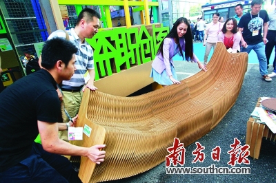 深圳創(chuàng)客數(shù)量已經(jīng)過萬,今后每年將舉辦創(chuàng)客周活動(dòng)。圖為文博會(huì)期間創(chuàng)客展示的一款可伸縮環(huán)保紙凳。南方日?qǐng)?bào)記者 魯力 攝