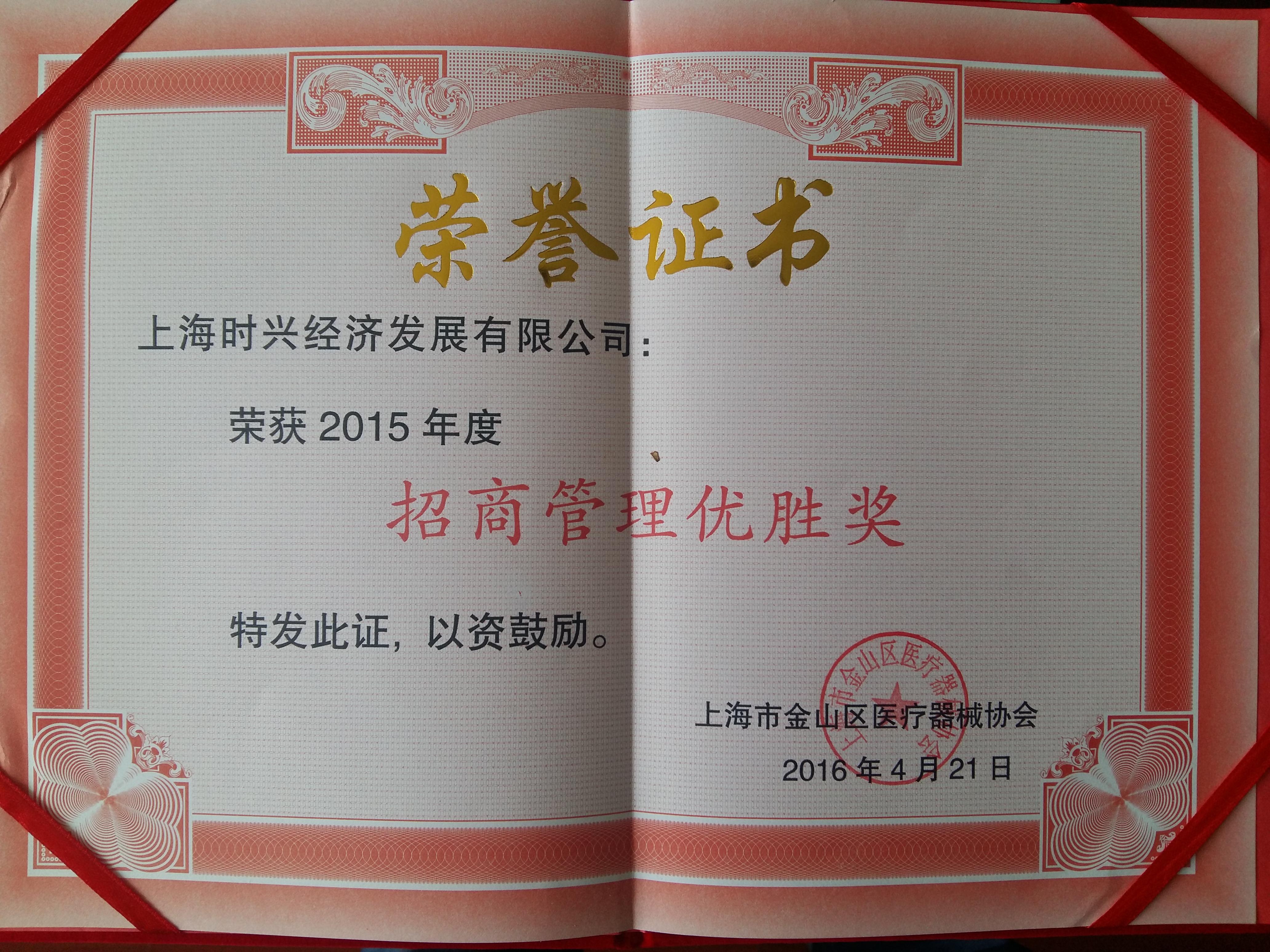 4月21日下午金山區(qū)醫(yī)療器械協(xié)會召開第二屆第二次會員大會,上海時興經(jīng)濟發(fā)展有限公司榮獲2015年度招商管理優(yōu)勝獎,注冊在時興經(jīng)濟小區(qū)的企業(yè)上海契克實業(yè)有限公司榮獲2015年度納稅貢獻獎。
