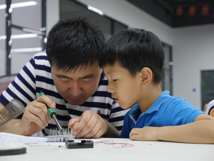 爸爸媽媽們陪孩子一同插元器件焊接,滿滿的愛