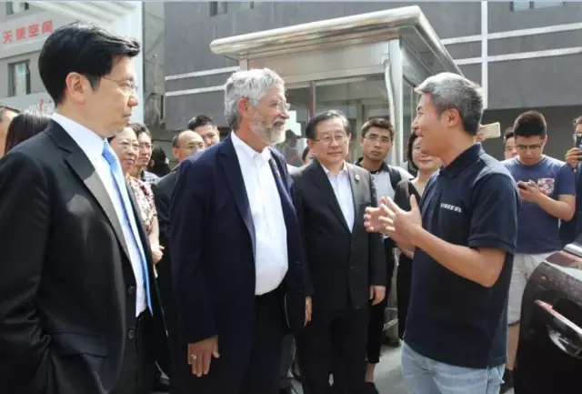 2016年6月7日,美國總統(tǒng)科技助理兼白宮科技政策辦公室主任John Holdren博士,美國白宮科技政策辦公室高級政策顧問Mahlet Mesfin,美國駐華使館科技官員 Dwain Atkinson攜代表團(tuán)一行參觀中關(guān)村創(chuàng)業(yè)大街。全國政協(xié)副主席、科技部部長萬鋼,科技部火炬中心主任張志宏,北京市科委主任閆傲霜,科技部國際合作司副巡視員蔡嘉寧,中關(guān)村管委會國際化業(yè)務(wù)總監(jiān)曾曉東,創(chuàng)新工場創(chuàng)始人、董事長李開復(fù),馭勢科技(北京)有限公司聯(lián)合創(chuàng)始人、首席執(zhí)行官(馭勢無人駕駛)吳甘沙,科通芯城集團(tuán)及硬蛋科技首席技術(shù)官李世鵬等陪同參觀。海淀置業(yè)總經(jīng)理助理、海置科創(chuàng)董事長姚宏波,清控科創(chuàng)總裁助理、海置科創(chuàng)執(zhí)行總經(jīng)理聶麗霞等接待了來訪嘉賓。