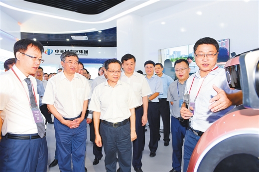 7月24日,南寧·中關(guān)村雙創(chuàng)示范基地在南寧高新區(qū)揭牌運(yùn)營。揭牌儀式前,自治區(qū)主席陳武參觀了南寧·中關(guān)村協(xié)同創(chuàng)新展示中心。 本報(bào)記者梁凱昌/攝