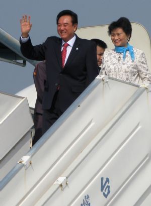 Chen Yunlin (front, L), president of the Chinese mainland's Association for Relations Across the Taiwan Straits (ARATS), arrives in Taichung, Taiwan, Dec. 21, 2009. Chinese mainland's chief negotiator for Taiwan affairs Chen Yunlin Monday arrived in Taichung for a new round of talks.(Xinhua/Yuan Man)