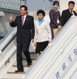 Chen Yunlin (L), president of the Chinese mainland's Association for Relations Across the Taiwan Straits (ARATS), arrives in Taichung, Taiwan, Dec. 21, 2009. Chinese mainland's chief negotiator for Taiwan affairs Chen Yunlin Monday arrived in Taichung for a new round of talks.(Xinhua/Ying Jian)