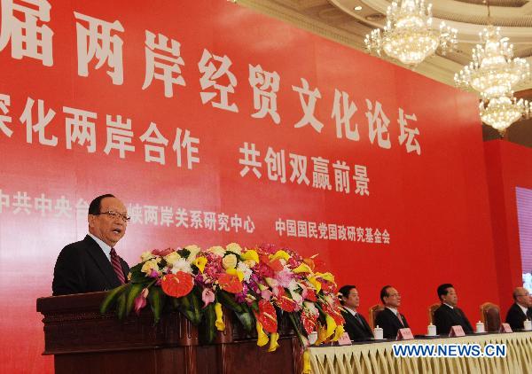 Kuomintang (KMT) Vice Chairman Chiang Hsiao-yen reads the forum proposal at the conclusion ceremony of the Cross-Strait Economic, Trade and Culture Forum, a regular forum between the Chinese mainland and Taiwan, in Chengdu, capital of southwest China's Sichuan Province, May 8, 2011. Jia Qinglin, member of the Standing Committee of the Political Bureau of the Communist Party of China (CPC) Central Committee, and Kuomintang (KMT) honorary chairman Wu Poh-hsiung attended the ceremony Sunday. (Xinhua/Rao Aimin) |