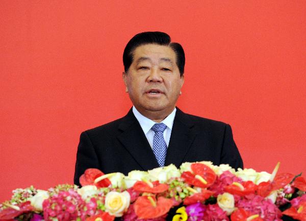 Jia Qinglin, member of the Standing Committee of the Political Bureau of the Communist Party of China (CPC) Central Committee, addresses the opening ceremony of the Cross-Strait Economic, Trade and Culture Forum, a regular forum between the Chinese mainland and Taiwan, held in Chengdu, capital of southwest China's Sichuan Province, May 7, 2011. Jia Qinglin and Kuomintang (KMT) honorary chairman Wu Poh-hsiung attended the opening ceremony. More than 400 representatives and experts from both sides attended the forum. (Xinhua/Rao Aimin)