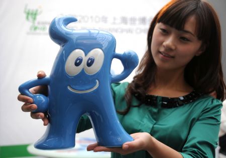 A woman shows the Shanghai World Expo licensed ceramic in the shape of Haibao, the mascot of Shanghai World Expo, at the exhibition hall of 2009 China Jingdezhen International Ceramic Fair in Jingdezhen, east China's Jiangxi Province, Oct. 17, 2009. The 2009 China Jingdezhen International Ceramic Fair will be held from Oct. 17 to Oct. 22 in Jingdezhen. (Xinhua/Shi Weiming)