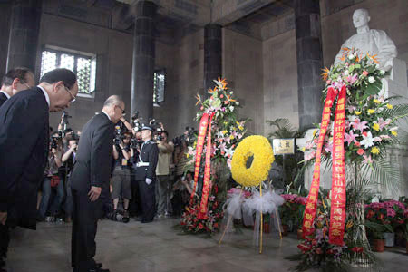 Kuomintang (KMT) Chairman Wu Poh-hsiung (2nd R, front) addresses during his visit to the mausoleum of Dr. Sun Yat-sen in Nanjing, capital of east China's Jiangsu Province, June 1, 2009. (Xinhua/Xing Guangli)