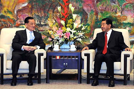 Jia Qinglin (R), member of the Standing Committee of the Communist Party of China Central Committee Political Bureau and chairman of the National Committee of the Chinese People's Political Consultative Conference (CPPCC), meets with Lien Chan, honorary chairman of Chinese Taiwan's ruling Kuomintang party, in Shanghai, east China, on Dec. 19, 2008. (Xinhua/Li Xueren) |