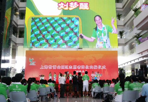 A group of volunteers attend a handing over ceremony at the World Expo Park in Shanghai, east China, Aug. 8, 2010. The seventh and the eighth batch of volunteers held a handing over ceremony in the World Expo Park as Shanghai Expo marks 100th day Sunday. (Xinhua/Gao Nan)