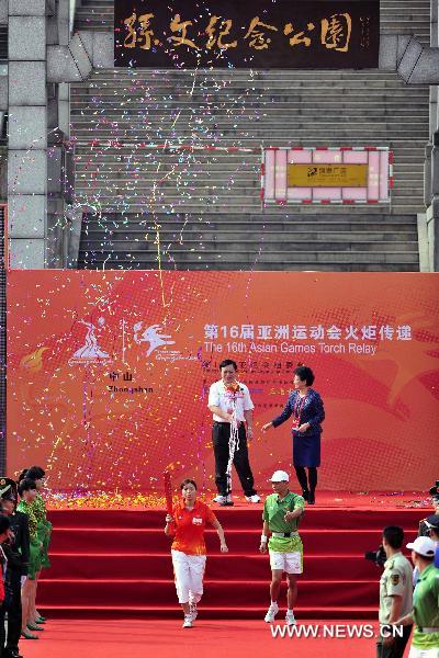 The first torchbearer Yang Wei(Center L) runs with the torch during the torch relay for the 16th Asian Games in Zhongshan, south China's Guangdong Province, Oct. 13, 2010. (Xinhua/Chen Yehua)