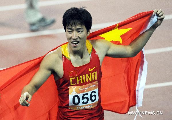 China's Liu Xiang jubilates after the men's 110m hurdles final of athletics at the 16th Asian Games in Guangzhou, south China's Guangdong Province, Nov. 24, 2010. Liu claimed the title of the event with 13.09 seconds. (Xinhua/Li Yong)