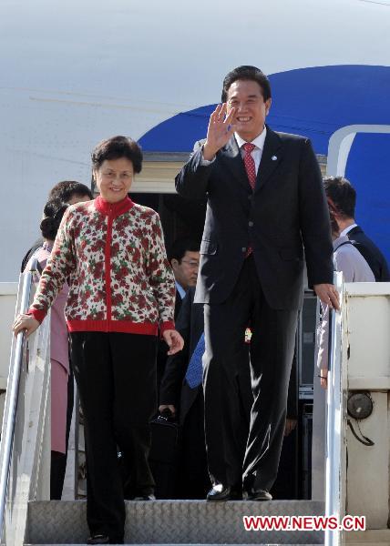 Chen Yunlin (R, front), president of Chinese mainland's Association for Relations Across the Taiwan Strait (ARATS), waves after arriving at the Taoyuan International Airport in Taipei, southeast China's Taiwan, Dec. 20, 2010. Chen and his delegation arrived. (Xinhua/Song Lidong)