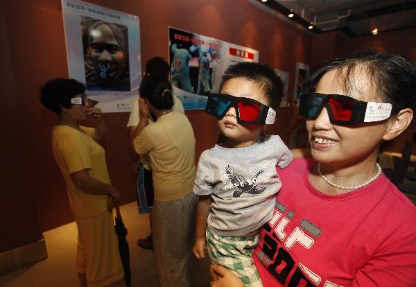 Ma Xiaomi (2nd, right) together with his mother visits the first three dimensional (3D) World Expo photo gallary in Shanghai, east China, Aug. 28, 2010. More than 120 3D photos about Shanghai World Expo were displayed in Baoshan District, east China's Shanghai. (Xinhua/Pei Xin)