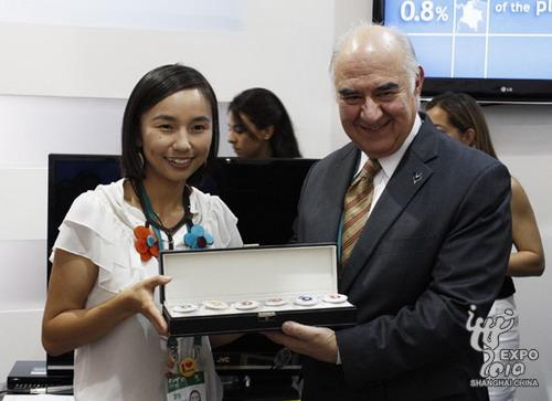 A girl with the International Council of Museums Pavilion presents pins to commissioner general of the Colombia Pavilion.