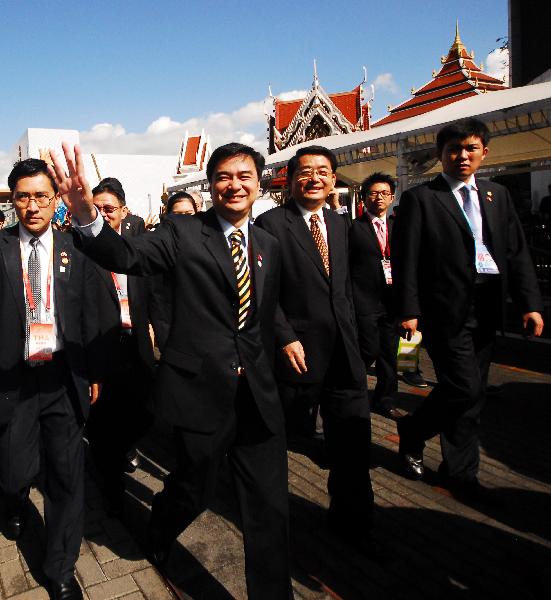 Thailand's Prime Minister Abhisit Vejjajiva (2nd L) greets tourists outside the Thailand Pavilion as he visits the World Expo Park in Shanghai, east China, Sept. 5, 2010. A ceremony was held on Sunday at the 2010 World Expo to mark the National Pavilion Day for Thailand. (Xinhua)