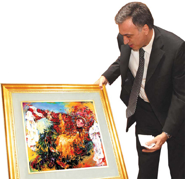 The executive committee of the 2007 Special Olympics World Summer Games presents an embroidery piece of Liu Linghua's oil painting Drunken Beauty to the director-general of the Game's opening ceremony Don Mischer.(Source: China Daily)